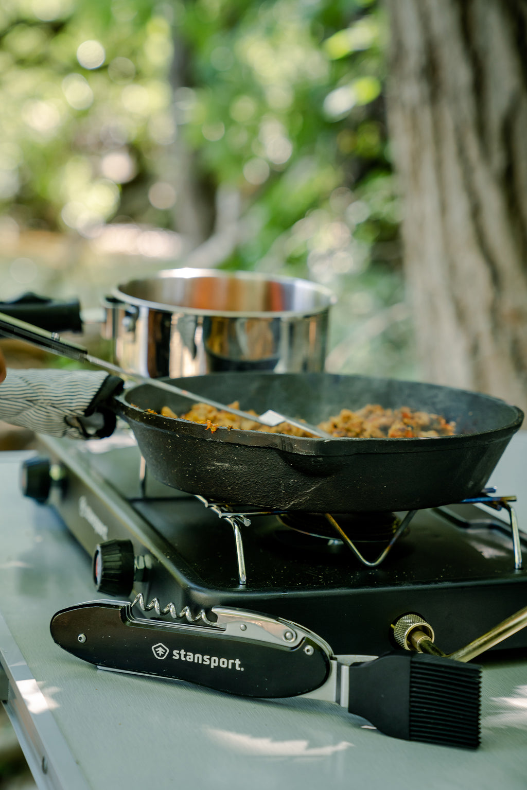 - Utensils fold into handle and carry easily in carry pouch