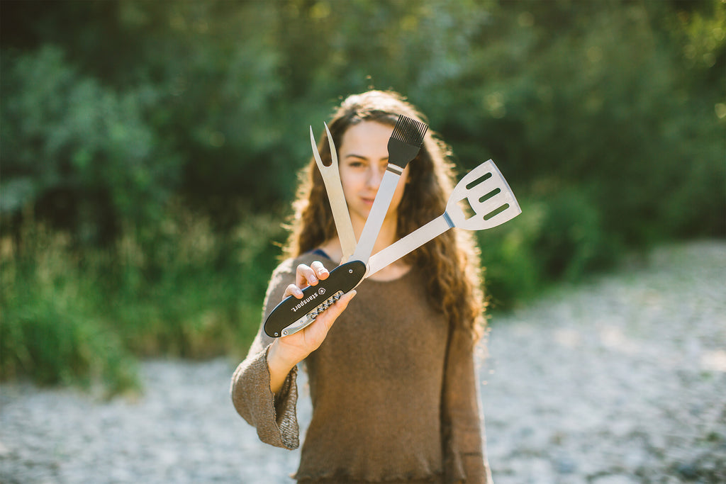 With our 5-in-1 BBQ multi tool, you have all the gear you need to be a "BBQ Hero!" Flip burgers with the spatula, spear a brat with the fork, and smear some sauce with the silicone basting brush. For the finale - open some wine or a beer with the included corkscrew and bottle opener! All of the included utensils fold into the handle and stow easily in carry pouch.