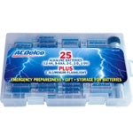 Emergency Battery Kit includes 25 Akaline Battaries (12-AA, 8-AAA,2-C,2-D,1-9V), plus 1 Aluminum Flashlight and 1 AM/FM Radio.