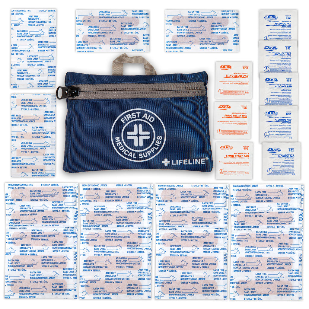 Kit contains over 45 components of essential first aid supplies, including 4 different types of bandages to prepare you for minor cuts and scrapes. Its compact size is great for storing in backpacks, desk drawers and vehicles. The soft case is designed with a zipper closure, that conveniently keeps the supplies secure, and includes a sturdy handle.