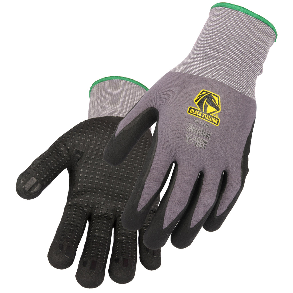 Black Stallion GC1526-GB AccuFlex™ Nitrile Micro-Foam Dot Grip Knit Glove is made with 15-gauge nylon/spandex knit which is ultra-lightweight, breathable, and comfortable. Nitrile micro-foam coated palms and fingers offers excellent resistance to oil, grease, and certain solvents. The Micro-dot pattern on palm provides an exceptional oily, wet, and dry grip. The darker colors of the GC1526-GB hides grime and dirt to extend wear and Color-coded bindings for quick and easy size identification. Tested to EN388 4131, the GC1525 has also been tested to be Level 4 ABRASION resistance and Level 3 TEAR resistance.