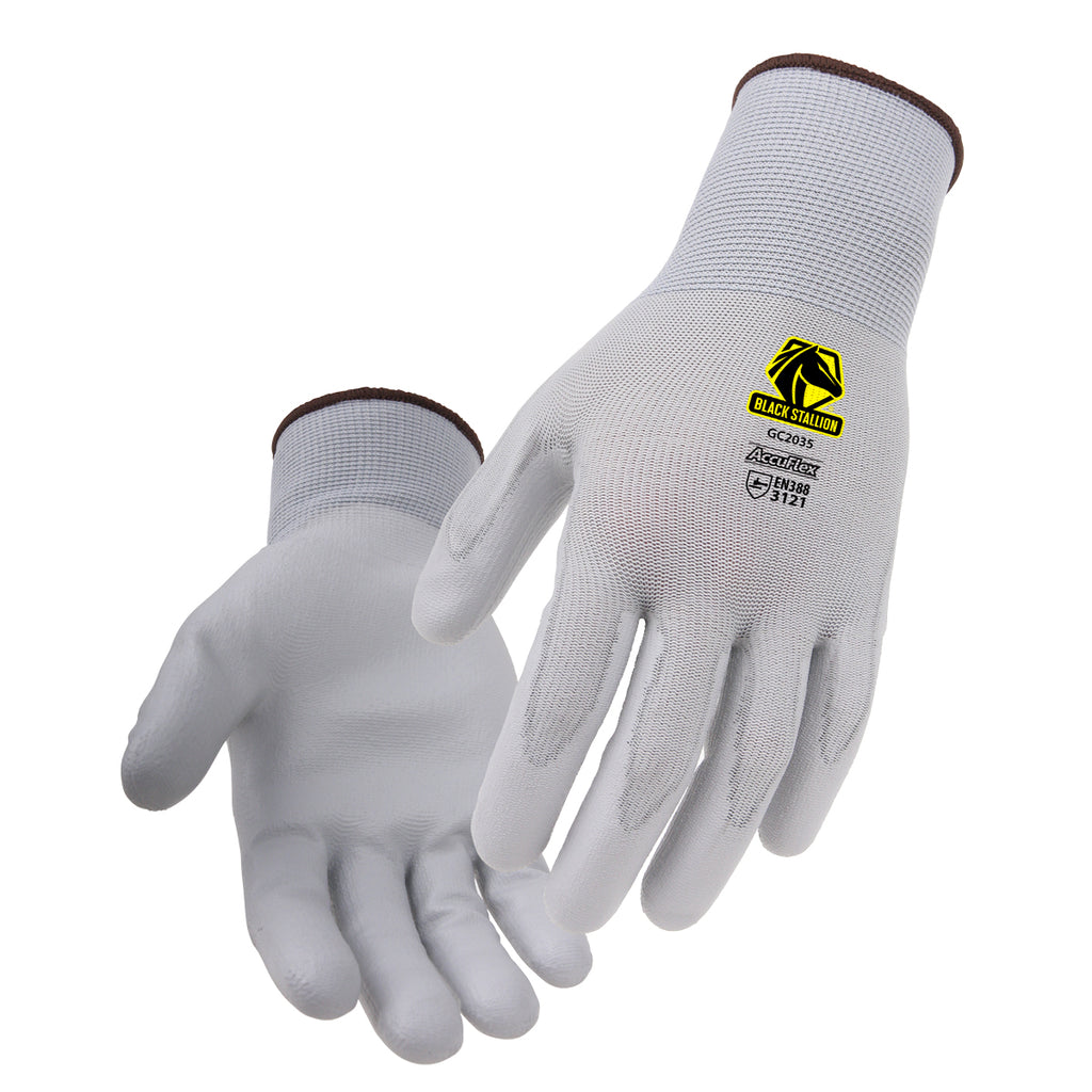 Black Stallion GC2035-GY AccuFlex™ 13-Gauge PU-Coated Nylon Knit Glove is comfortable for many types of situations such as Assembly, Industrial, Construction or Machine Operation. High-dexterity 13-gauge nylon knit are coated with flexible polyurethane on the palm and fingertips. PU coating provides excellent dexterity and abrasion resistance and good grip in dry conditions. Rated EN388 3121, combined with the comfortable breathable back, and color coded binding for easy size identification.