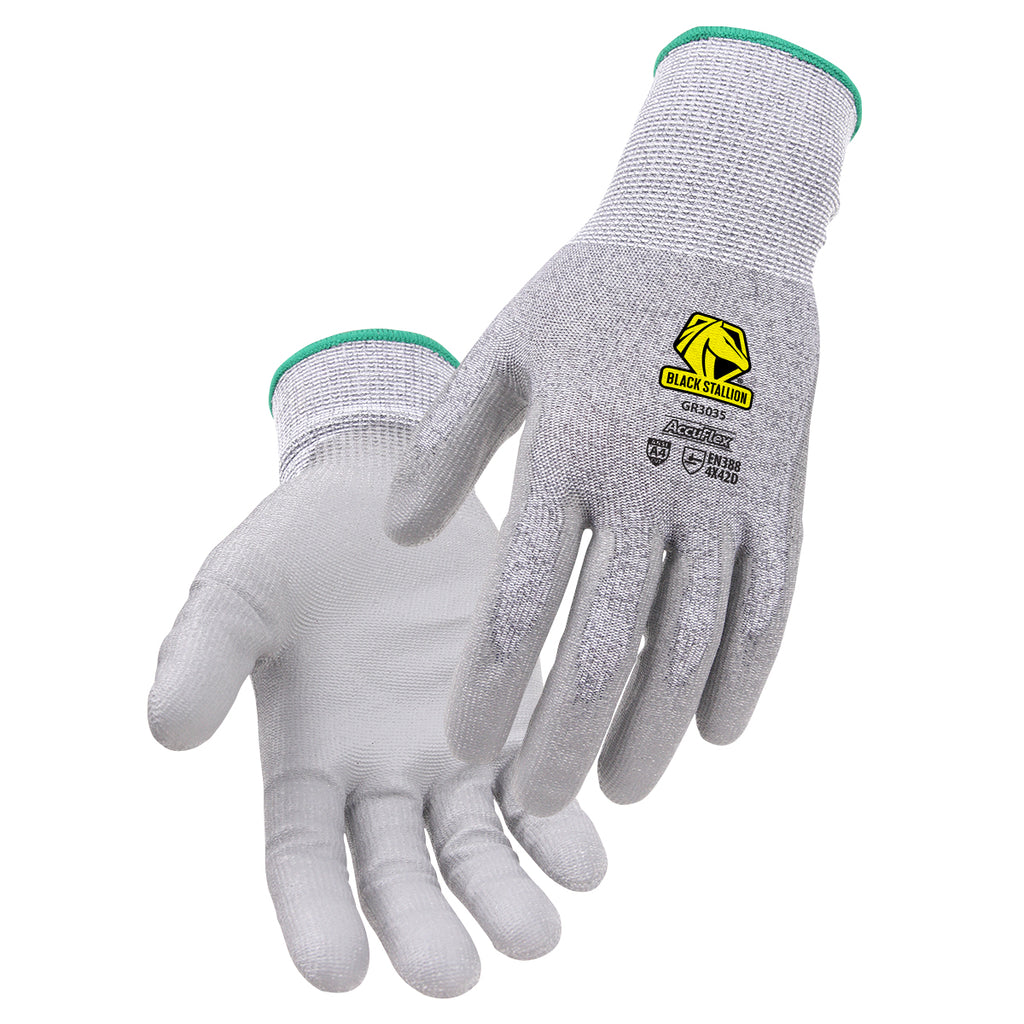The Black Stallion® GR3035-GY AccuFlex™ A4 Cut-Resistant PU-Coated Knit Glove offers ANSI A4 cut protection and an excellent grip. The 15-gauge HPPE knit blend is coated with a flexible PU coating, making it have outstanding dexterity. Thanks to the PU coating, it has an excellent grip without feeling sticky, even when wet. Each glove is color coded binding for EZ size ID, and offers ANSI Cut Level A4 protection and is rated at EN388 4X42D.
