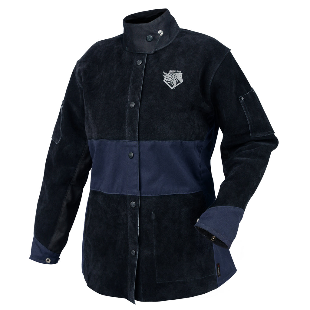 The Black Stallion® JH1515-NB is our AngelFire® Women's Hybrid Welding Jacket, Navy & Black. Tailored fit designed specifically for women welders, it combines durable black split cowhide sleeves, shoulders, chest, torso with lightweight navy blue FR cotton midsection, underarms, and collar. Cowhide "spark strip" along the bottom half provides additional torso heat and spark protection while the 3-position waist adjustment strap allows you to adjust the fit. It also features stand-up welders collar, convenient scribe pockets on both sleeves, and inside pocket holds phone and small items.