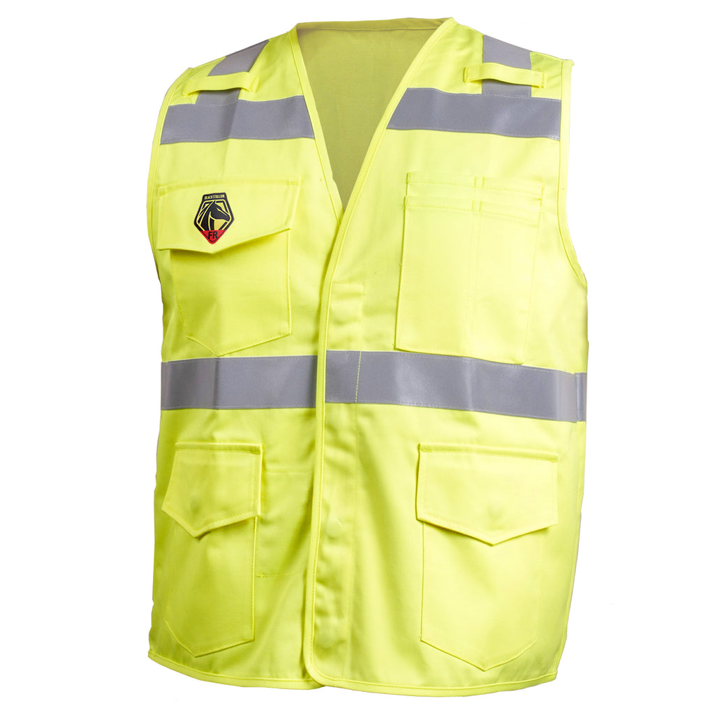 The Black Stallion VF1110-HY Hi-Vis Class 2 FR Cotton Vest is designed for workers in hazardous conditions where being “seen” is critical. Being made of 9 oz. FR-treated 100% cotton, it is ANSI/ISEA 107-2015 Type R Class 2 compliant ( ATPV 8.2 cal/cm2.); also NFPA 70E and ASTM 1506 compliant. It features 7 exterior pockets hold lots of small tools and gear, Mic tabs provide easy access to remote microphone, and back access slot for pass-through of fall protection harness. Additionally the concealed snap fasteners for quick on and off.