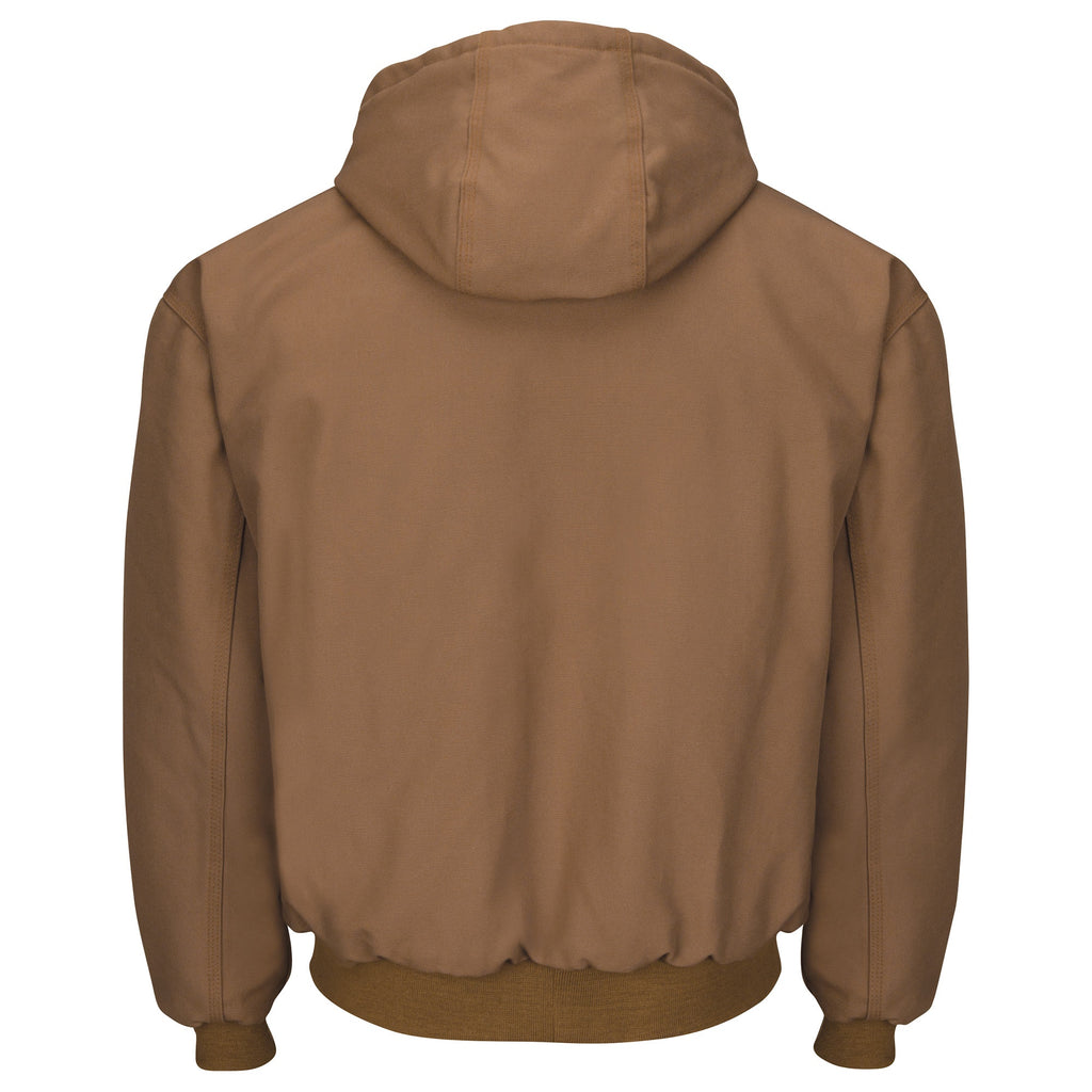 This heavyweight CAT 4 AR/FR brown duck jacket has quilted insulation that offers extra warmth for cold days on the job. It's designed with special features to keep you warm and safe in the field, like a three-piece hood and knit cuffs and waistband that helps the jacket stay in place and prevents exposed skin.