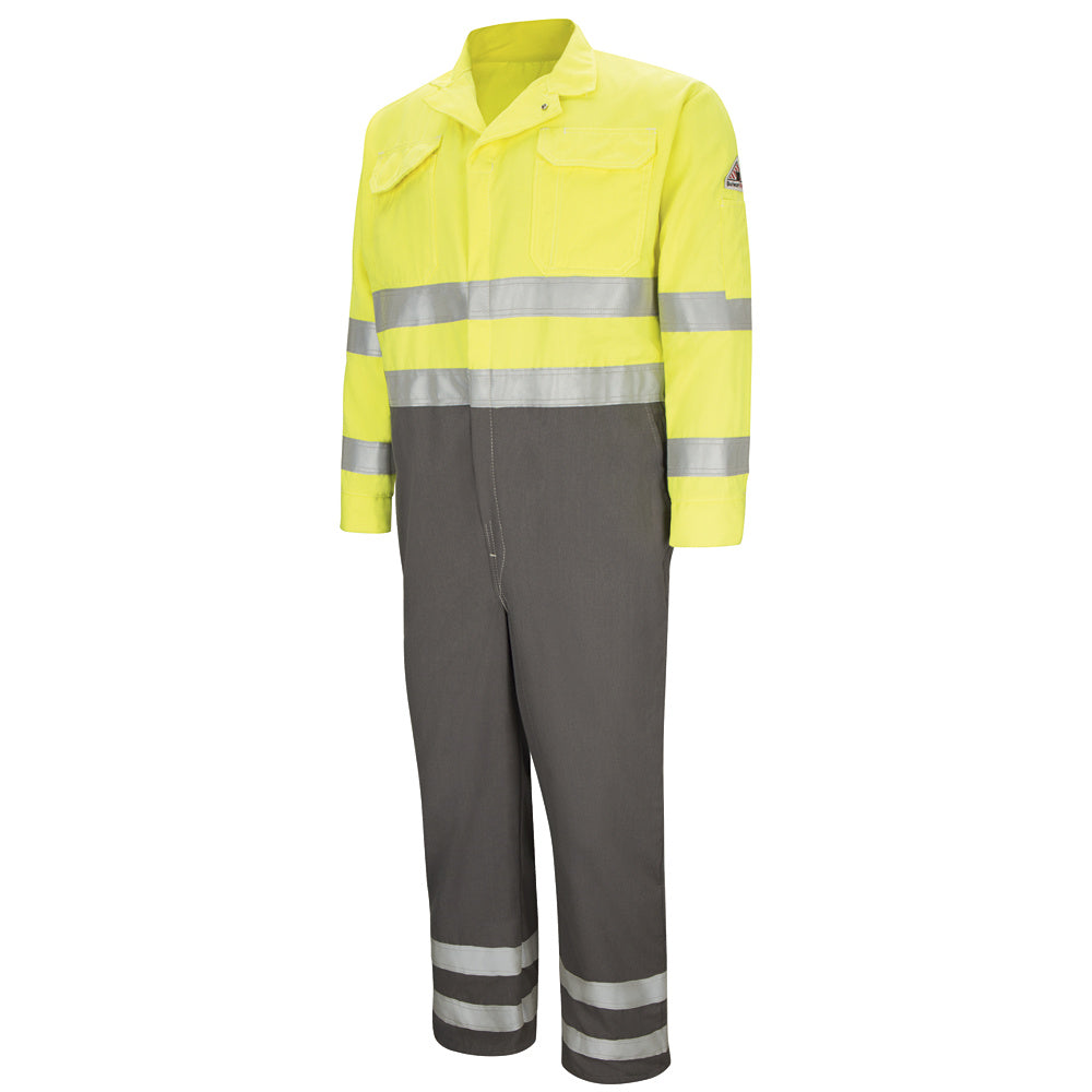 Colorblocked hi-vis yellow and grey, One-piece, top-stitched, lay-flat collar, One-piece bi-swing action back, Two-way concealed, Nomex® tape, brass, break-away zipper, concealed snap at top of zipper at neck, Concealed snap closure on sleeve cuff, Two, two-needle top-stitched patch chest pockets with flaps and concealed snap closure, Two front swing pockets are top-stitched and lined, Two patch hip pockets have single concealed snap closure, One sleeve pocket sewn to left bicep with pencil stall, Rule pocket on right leg, Elastic waist inserts in back, 2" reflective trim around arms, legs, waist, and back.. For Sizing, please refer to our Manufacturer Size Chart Section, click here.