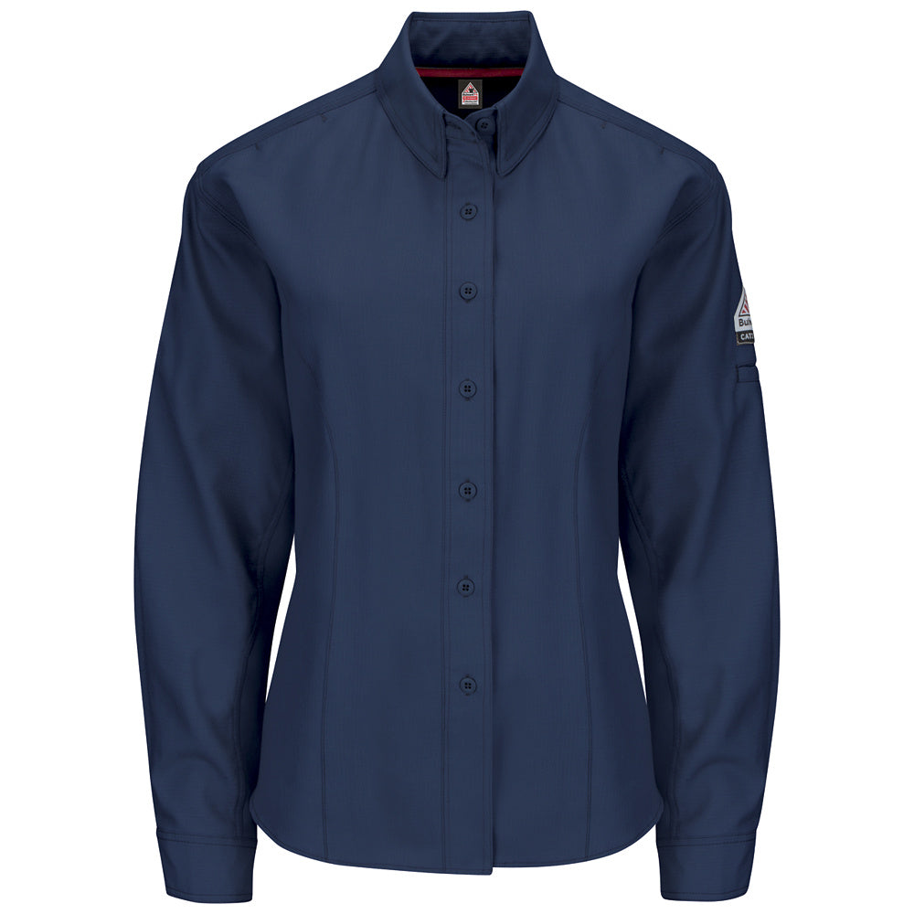 Banded, Topstitched collar with red trim at neck seam › Topstitched cuffs with button closures › Concealed sleeve pocket › Princess seams at front body for feminine fit › Gas monitor pocket at front shoulder › Full side seam gusset. For Sizing, please refer to our Manufacturer Size Chart Section, click here.