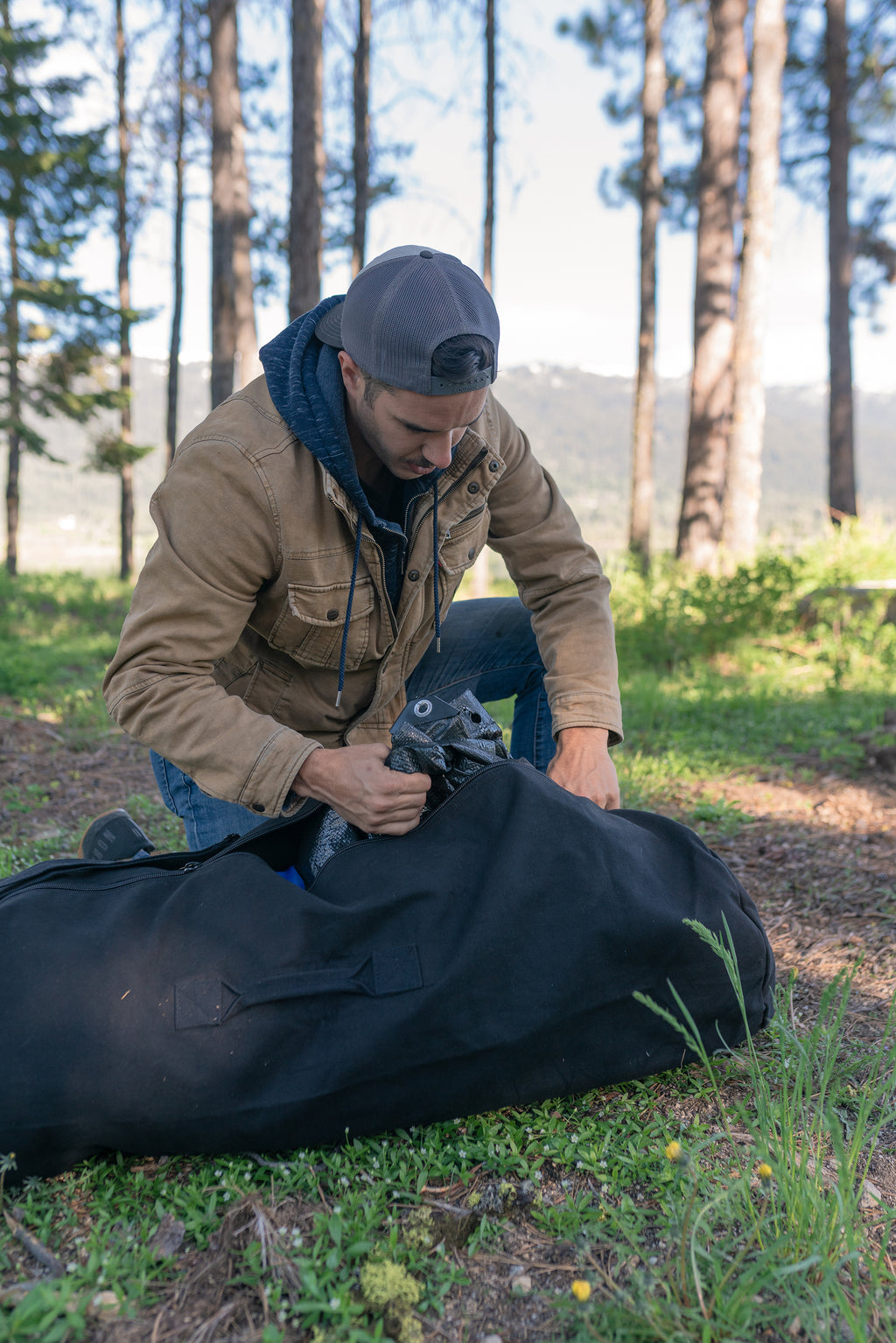 Camping, traveling, hunting - if you're an active person with a lot of gear to haul, this is the duffel bag for you! Our duffel adds impressive durability to significant capacity. It's constructed of heavy 22 oz. cotton canvas, amply reinforced at all stress points. With all that gear, you'll appreciate the dual web handles, and one handle in center, that make handling this fully loaded bag a snap.