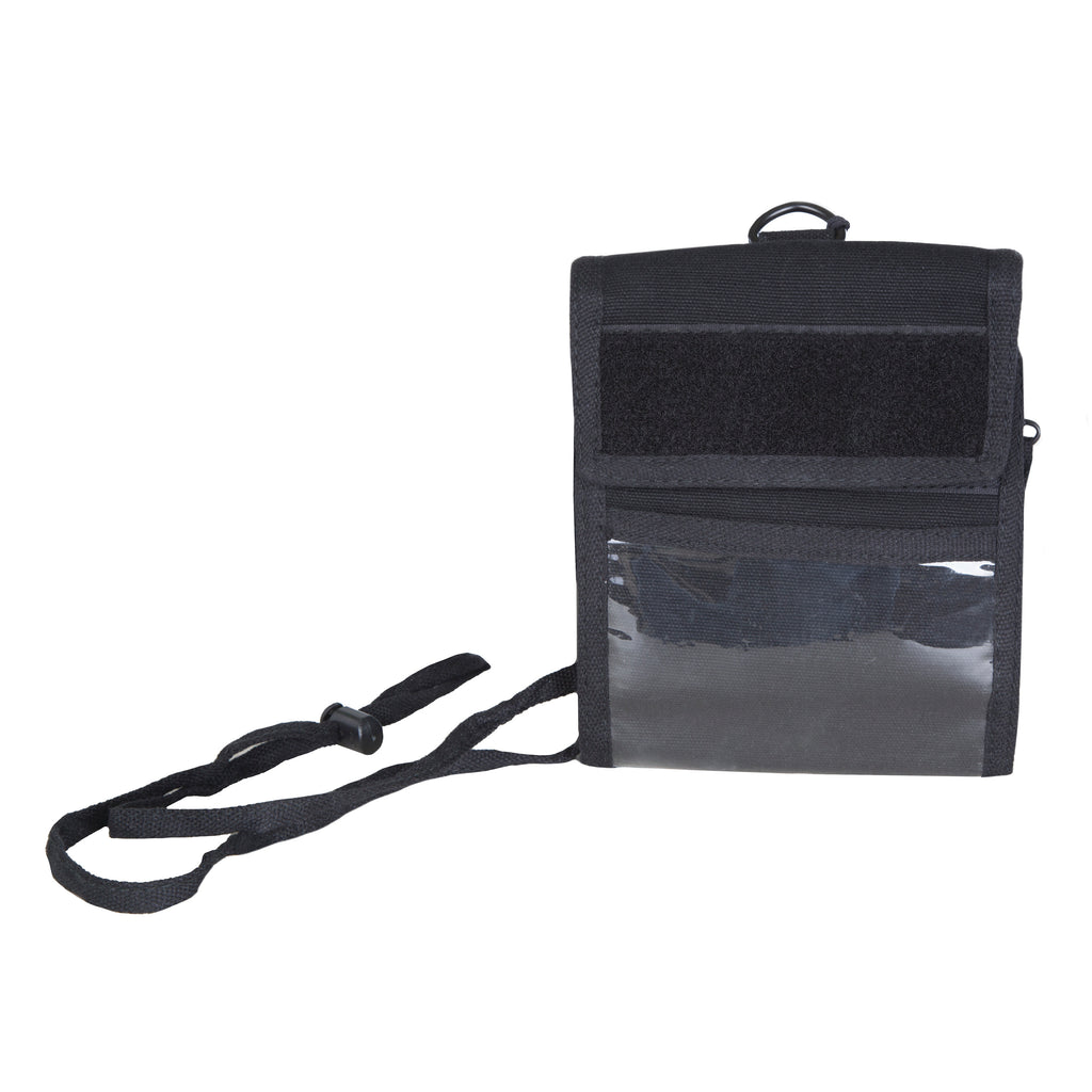 Cotton canvas black deluxe folding wallet features a front clear ID pouch, multiple card and storage slots, zippered coin pouch, bill compartment and tri-fold design. The webbing loop with "D" ring on top is ideal for extra accessories. Made of durable 22 ounce cotton canvas.