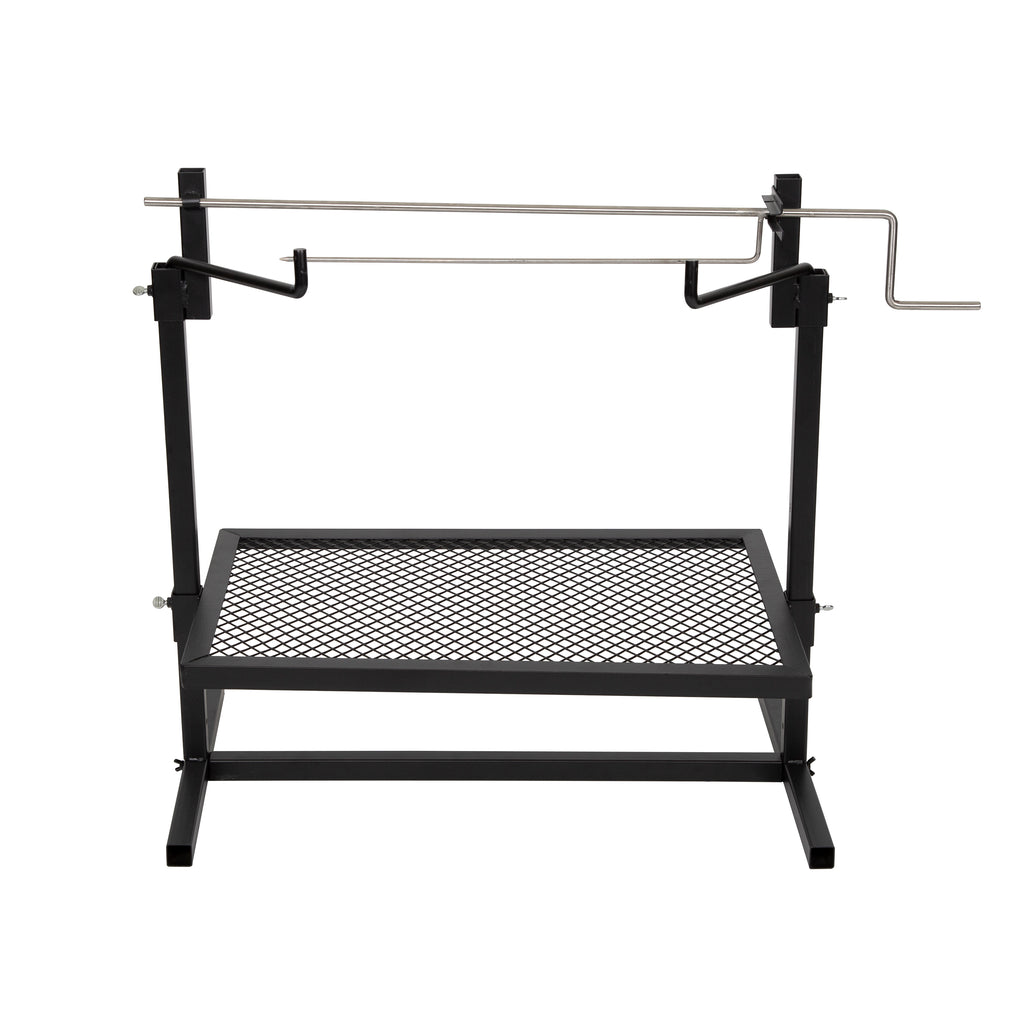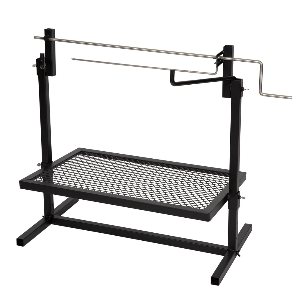 Nothing cooks large cuts of meat more evenly, and with more medieval style, than a rotisserie. Our heavy-duty model is made from sturdy steel, and includes a stainless steel rotisserie spit. It’s flexible - with a spit that locks in multiple positions, and the entire assembly can be adjusted up 44” high. And for campfire cooks who like to multitask, two removable steel arms will hold pots, kettles and other backcountry cooking accessories.