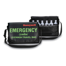 Honeywell Eyesaline® Personal Travel Bag securely holds six 1 ounce saline sterile eyewash bottles and six 4 oz saline sterile eyewash bottles for emergency use. Rugged, compact bag is highly portable and well-suited for immediate and continued flushing during transportation. Sleek, durable bag in one-piece case construction comes with pockets to hold bottles and a separate insert for important documents or additional first aid necessities. Bag made of vinyl material allows it to remain clean and visible while an adjustable strap allows bag to fit around the back of a car, sport utility vehicle seat for easy transport and convenience.