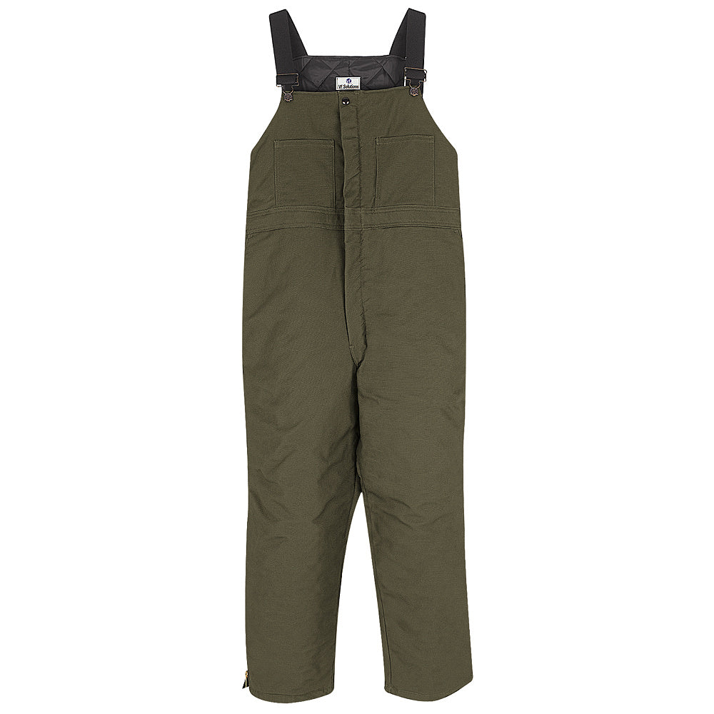 Reach-Through Ability at Side Behind Lower Front Pockets, 18" Side Leg Zippers. Shell: 10.0 oz.,. Per Square Yard, Cotton Canvas, Lining: 5.0 oz., Per Square Yard, Quilted Nylon with 70 Denier Polyester Batting. Shell: 100% Cotton Duck , Lining: 100% Quilted Nylon with Polyester Batting. Home Wash. . . Elasticized Straps with Brass Buckle Closure, Center-Front, Two-Way Zipper. . . Two Chest Patch Pockets, Two Front Hip Pockets with Snap Closure, Two Back Hip Pockets. .