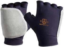 IMPACTO® Anti-Impact Glove Double Padded Glove. Fingerless, nylon Lycra® with suede leather palm. Double (1/4") VEP padding in the palm, edge and back of the hand. Double padded palm and side of hand provides excellent impact and shock protection.