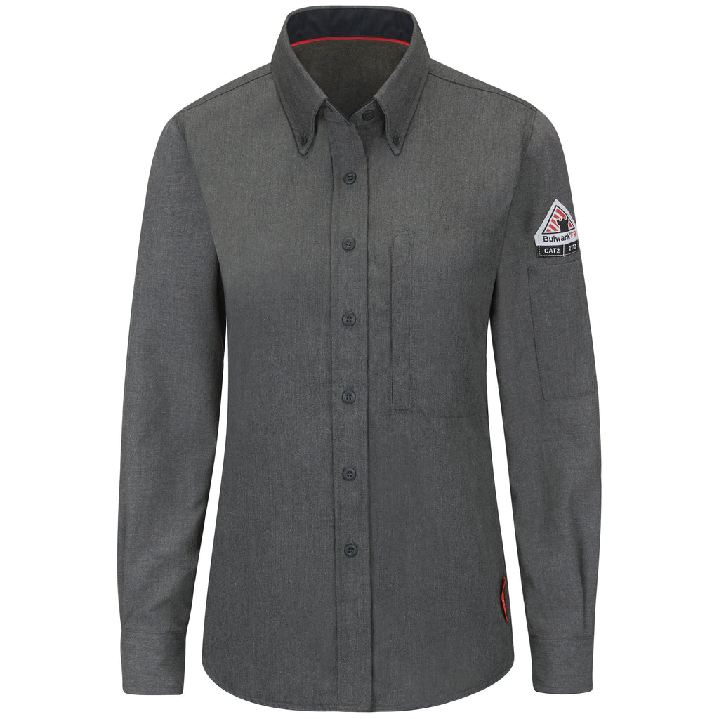 The newest advance in women's FR workwear. Workwear that's actually designed for a woman's body. Made exclusively from TenCate Evolv™, this FR button-front shirt features mobility panels across the back and full arm gussets for increased movement and comfort. Princess seaming gives this shirt a uniquely feminine fit and shape, with hidden pockets on each sleeve and exterior 2112 labels clearly visible. (Fit Chart: LFC-02)