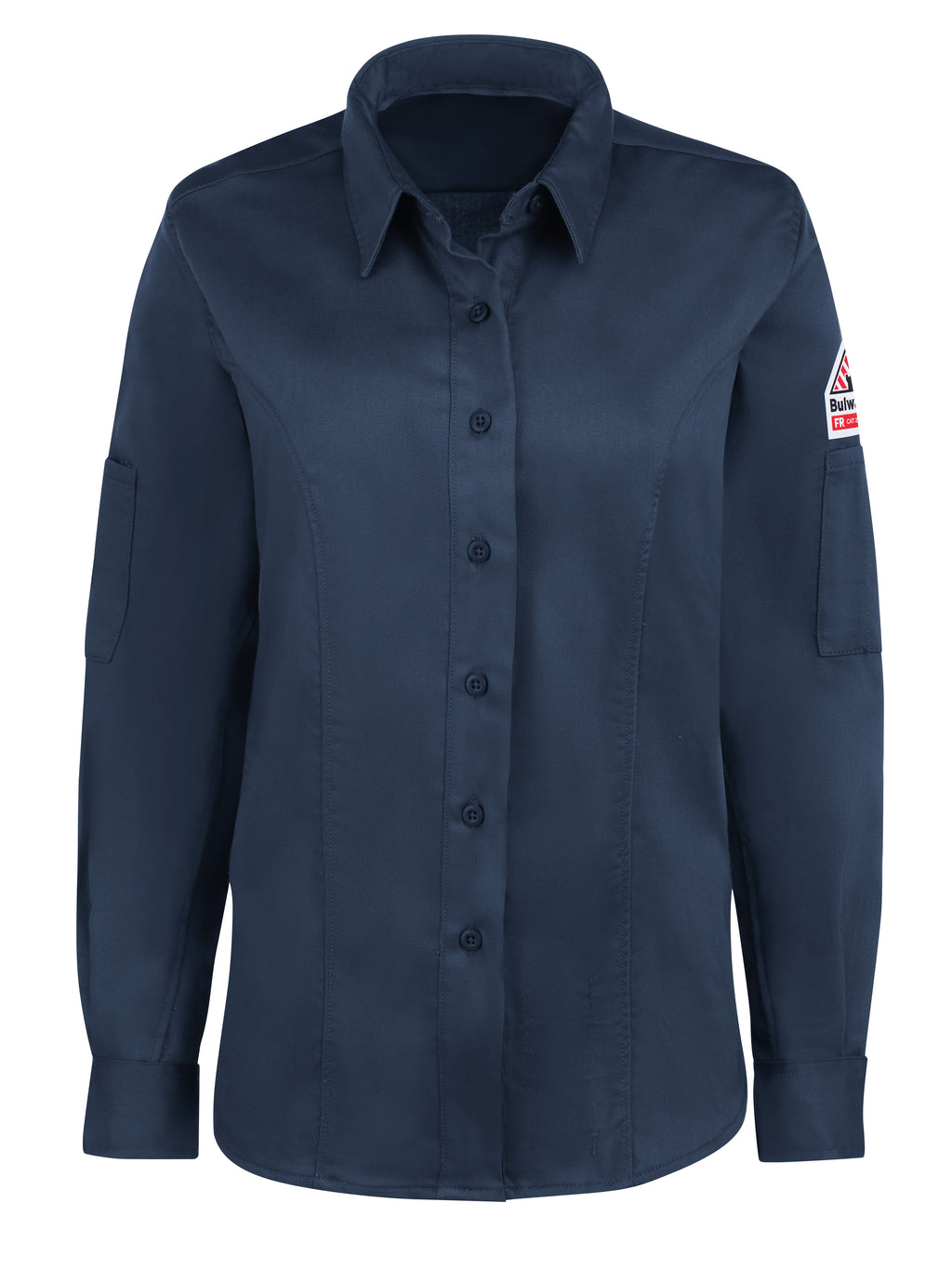 This women's work shirt is made exclusively from Westex G2™ fabrics by Milliken® and features woven mobility panels across the back and full underarm gussets for increased movement and comfort. It has princess seams that give the woven shirt a uniquely feminine fit. There are hidden pockets on each sleeve for storage and exterior 2112 labels clearly visible signifying complaince. (Fit Chart: LFC-02)