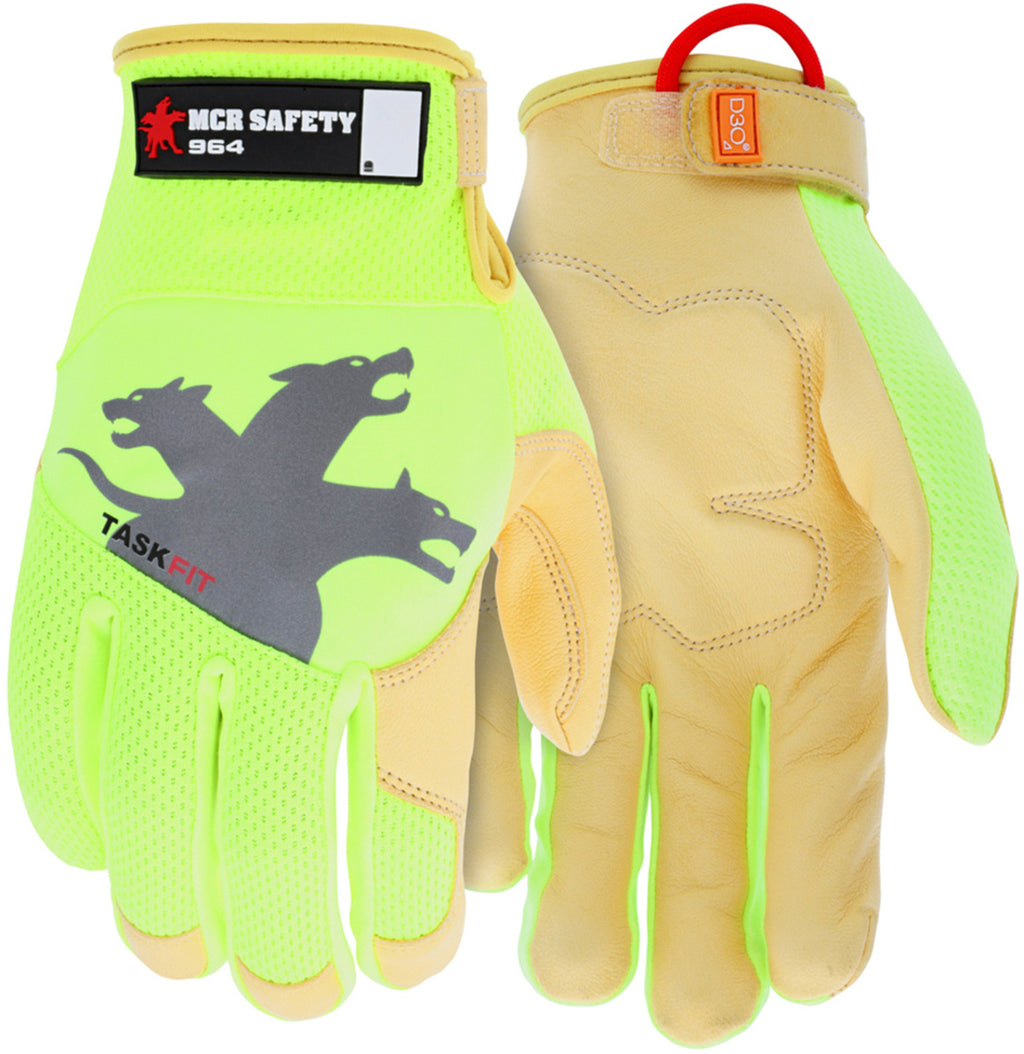 Safety, comfort, and style. These are the attributes industrial workers want in the gloves they wear. The MCR Safety 964 “TaskFit™” designed mechanics gloves with hook and loop cuff fits the need. The 964 features a high visibility lime super stretch knuckle region for greater flexibility, a super soft top grain honey gold goatskin leather palm, and a reflective logo on the back for added safety. The D3O® palm padding aids in reducing impact and vibration. The reinforced index finger and thumb crotch add durability in the high-stress areas.
