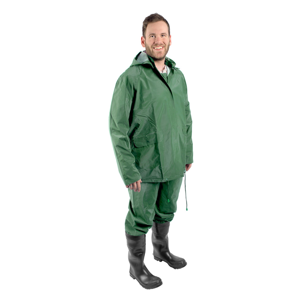 Don't let a little drizzle (or a full-on gale, for that matter) dampen your outdoor experience! Our 3-piece deluxe vinyl rainsuit provides complete rain protection, regardless of the conditions. We've built this suit from impermeable vinyl, with electrically welded seams, and included features like a full-flap zipper protector to keep you dry. Our removable hood features adjustable drawstring closures, and our pants include an elastic waist to fit outdoor enthusiasts of all sizes.
