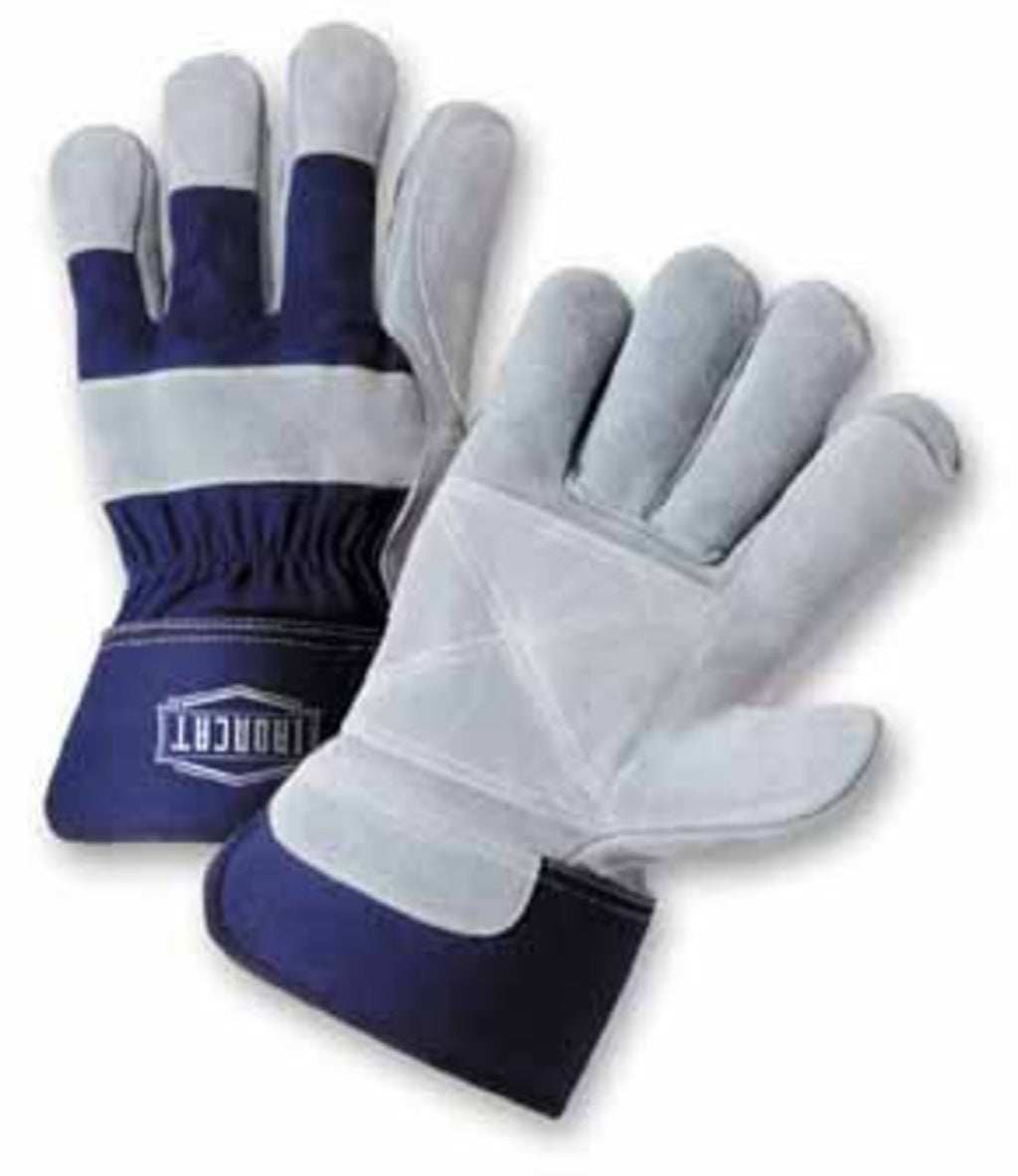 PIP® Ironcat® double leather palm work gloves are made of premium-grade heavy split cowhide that provides reliable hand protection. Rubberized 2 3/4" safety cuff, double Kevlar® stitched in a crisscross pattern helps protect wrists and prevents wear-through. Reinforced double leather on palm, index and middle finger, reinforced knuckle strap, welted seams on middle fingers makes it extremely durable. Pull tab, wing thumb provides extra strength. Application areas include construction, masonry, agriculture, iron/steel work, mining, transportation, electrical contractors and woodworking.