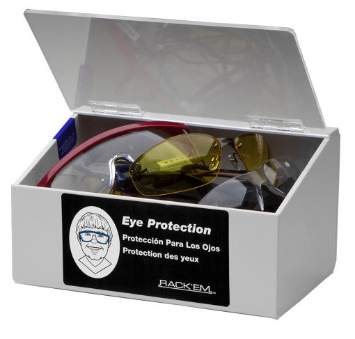 Holds 10 pairs of safety glasses or 60 foam ear plugs. Screw mounts into wall.