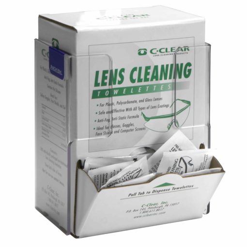 Lens Cleaning Towelette & Respirator Wipe box holder. Table or wall mounts for easy access.