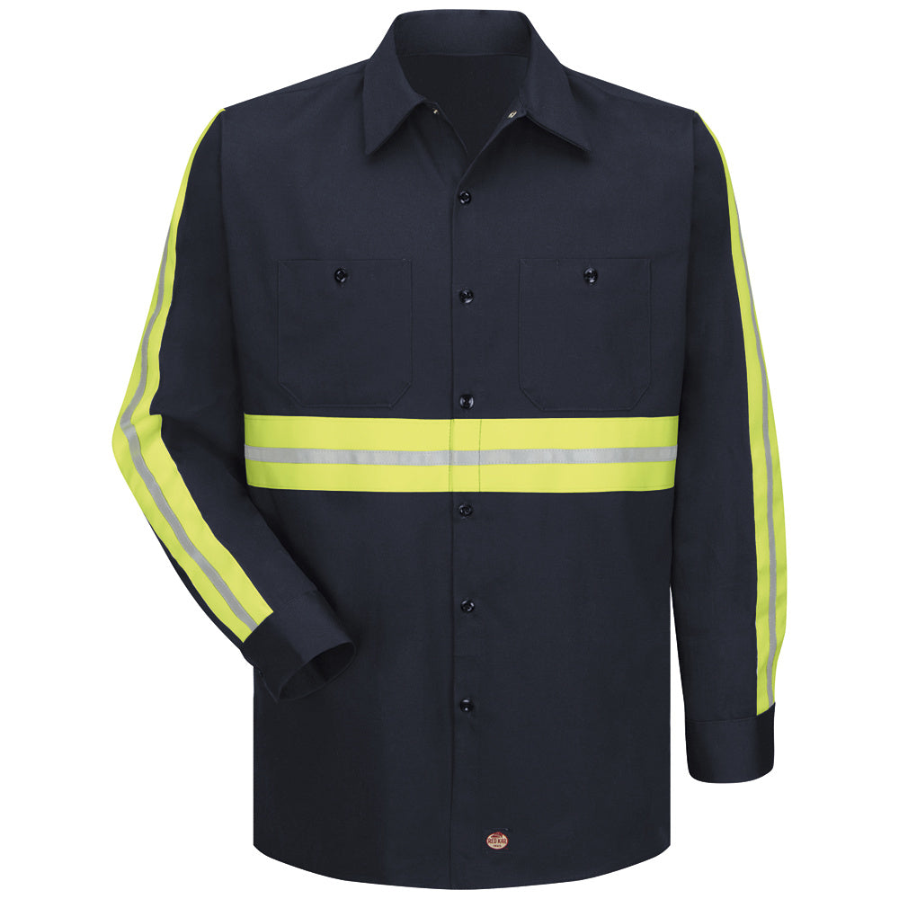 Two-piece, lined collar, Button-front closure, Pencil stall in left chest pocket, 2½" yellow/silver/yellow enhanced visibility trim around body, across back, and at sleeve from shoulder to sleeve end, This product does not comply with ANSI 107-2004 or AN. 6 oz. Twill. 100% Cotton. Industrial Wash. . . . Two-piece lined collar with sewn-in stays. . Two button-thru chest pockets, left with pencil stall. .2:2. For Sizing, please refer to our Manufacturer Size Chart Section, click here. (Fit Chart: MFC-46)