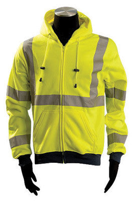 OccuNomix OccuLux® 3X Hi-Viz Yellow Wicking Polyester Class 3 Hooded Sweatshirt includes zipper front closure, 2 pockets for storing ID cards and microphone. It is made of Made of Whisk-It™ treated 100% polyester, specially designed to open up sealed fibers and create a moisture transport chunnel which continuously moves perspiration and away from body. It has 2" 3M™ Scotchlite™ reflective tape, one 360° horizontal stripe, two vertical stripes and four 360° horizontal sleeve stripes which is perfect for low light and day time conditions. It also includes strong zippered front, elastic cuff and waistband to hide dirt. It provides resistance to bacteria, odors and wrinkles. It meets ANSI 107-2004 Class 3 standard.