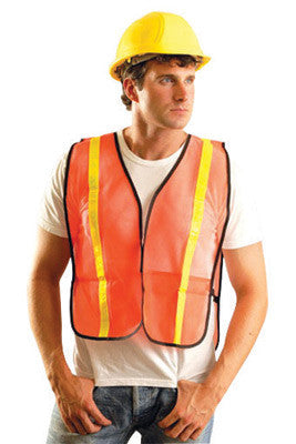 100% Polyester Mesh 1" glossy tape stripes: two vertical stripes front and back - Silver stripes on Yellow background; Yellow stripes on Orange background Pockets: 1 Inner Lower Left