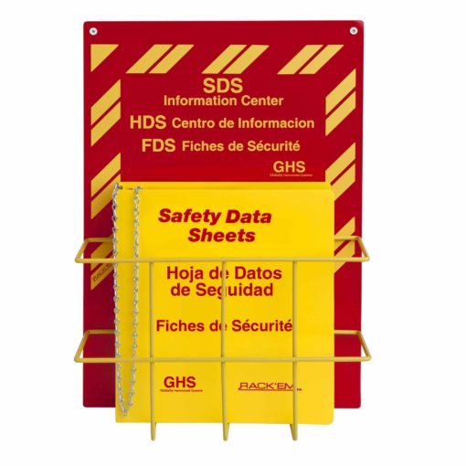 Rack’Em Racks Safety Data Sheet (SDS) Center is Globally Harmonized System (GHS) Compatible. SDS Center keeps safety data sheets visible, organized, and accessible to all employees. Includes SDS binder with chain, highly visible sign,and wire rack.