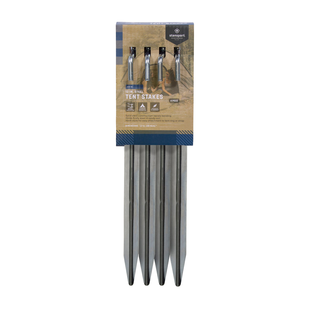 Tent stakes are the foundation of your campsite. These Stansport® 12” Steel Tent Stakes won't let you down! It's constructed of solid steel to resist bending and corrosion. The cross section is designed to hold firm, even in sandy, loose soils. We've added a hook for easy attachment to tent ring or strap. Stay prepared for all your future needs with this 4 pack.