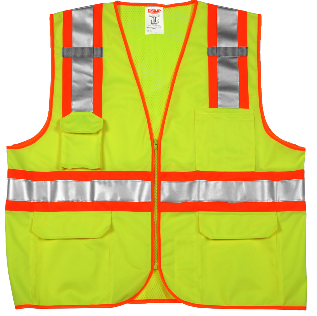 Type R Class 2 High Visibility Two-Tone Surveyor Safety Vest - Lightweight, affordable, features breathable polyester material and 2” silver reflective tape. • ANSI/ISEA 107 Type R Class 2 Compliant Vest. • Polyester Solid Front, Mesh Back. • Two-Tone 2” Silver Reflective Tape with Contrasting Backing. • Zipper Closure. • 2 Mic Tabs. • 5 Exterior Pockets. • 3 Interior Pockets
