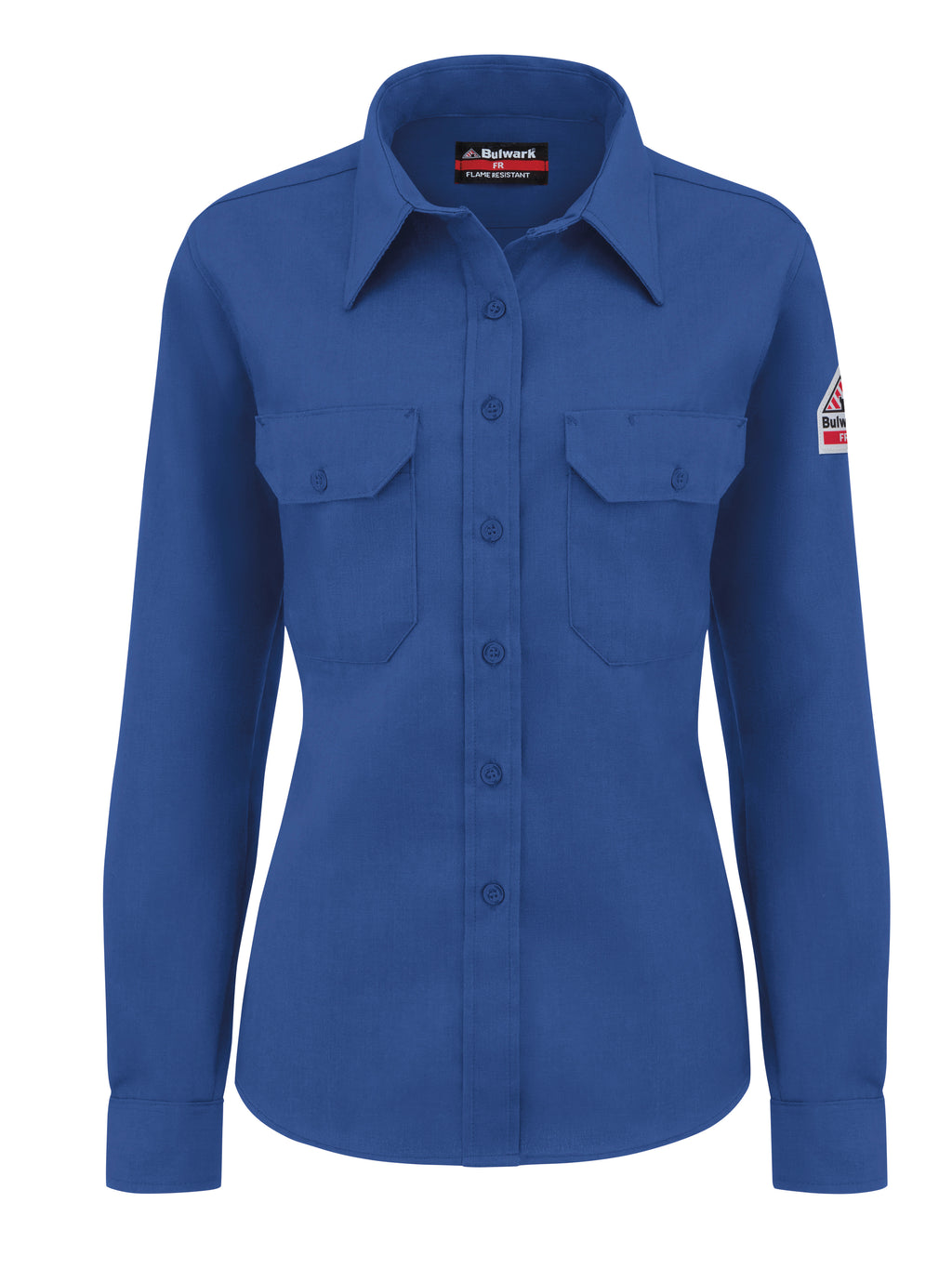 This lightweight women's FR dress uniform shirt offers a tailored, professional look with CAT 1 FR/AR protection and NFPA® 2112 compliance, plus darts on the back to create a feminine silhouette. (Fit Chart: LFC-02)